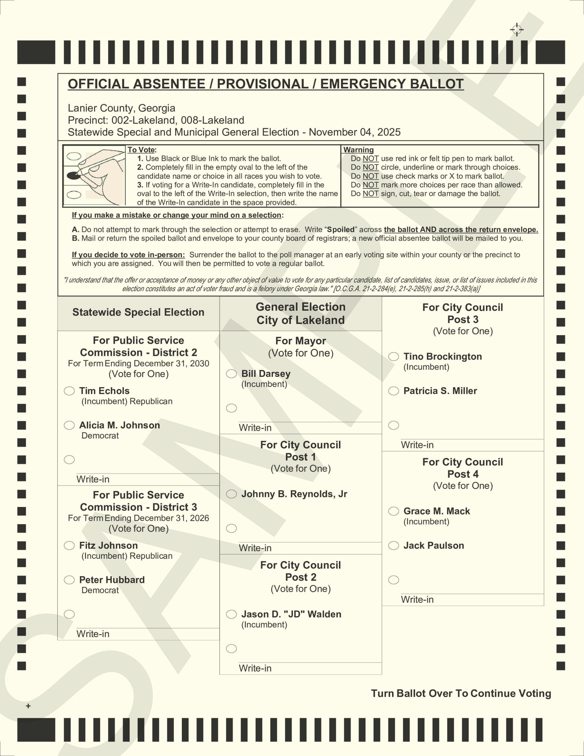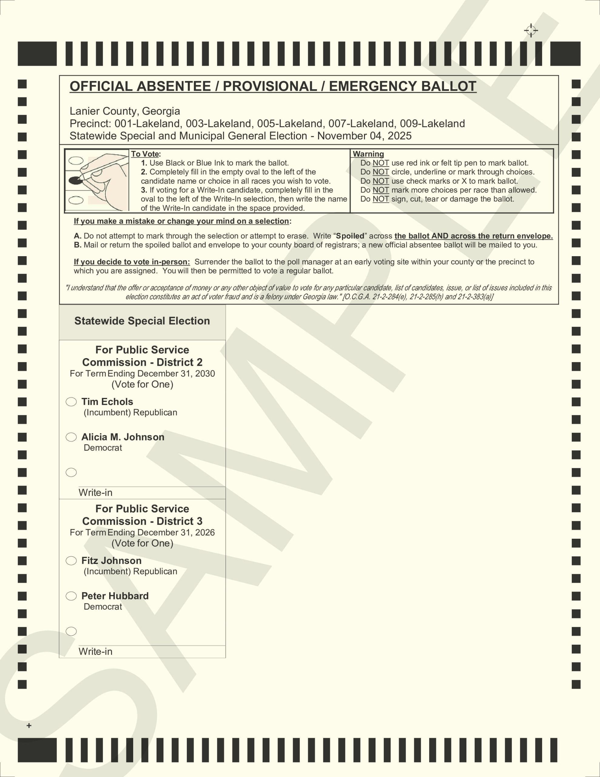 EARLY COMPUTATION: On Election Day, 04 November 2025, the Lanier County Elections office will begin tabulating ballots at 3:00 P.M. at 162 W. Thigpen Ave. Ste C., Lakeland. Results will not be available until after 7 P.M.